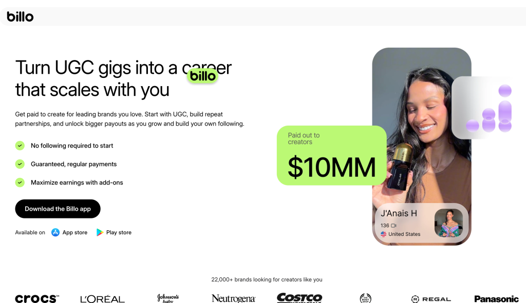 Billo is beginner-friendly and focuses entirely on short-form videos for ecommerce brands. You browse jobs, submit videos based on brand briefs and get paid.